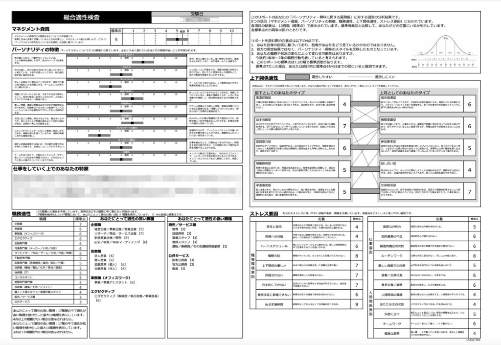 「マネジメント資質」「パーソナリティの特徴」「上下関係適正」「職務適正」など多くの項目で自己分析が可能です。
