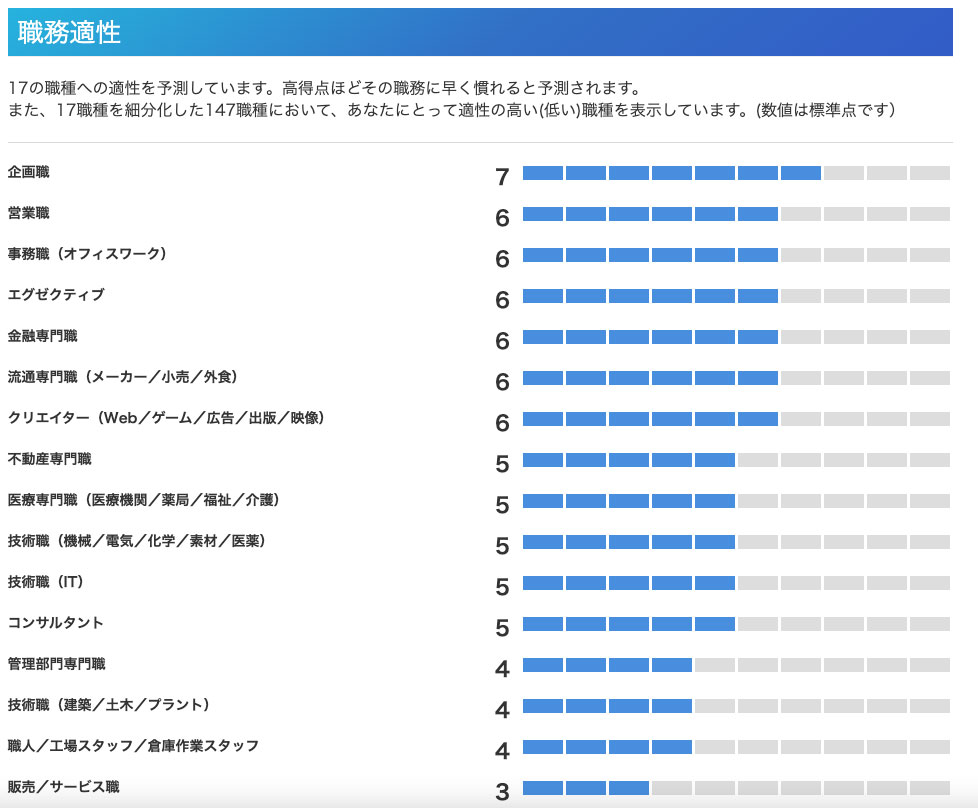 「職務適正」の項目では自分に合った職種を知ることができます。