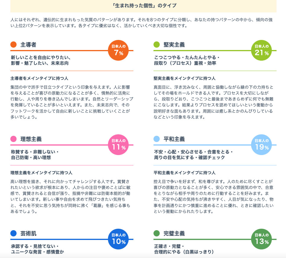 こちらも無料で受けることができ自分の「生まれ持った個性」や精神的な「今のコンディション」を知ることができます。